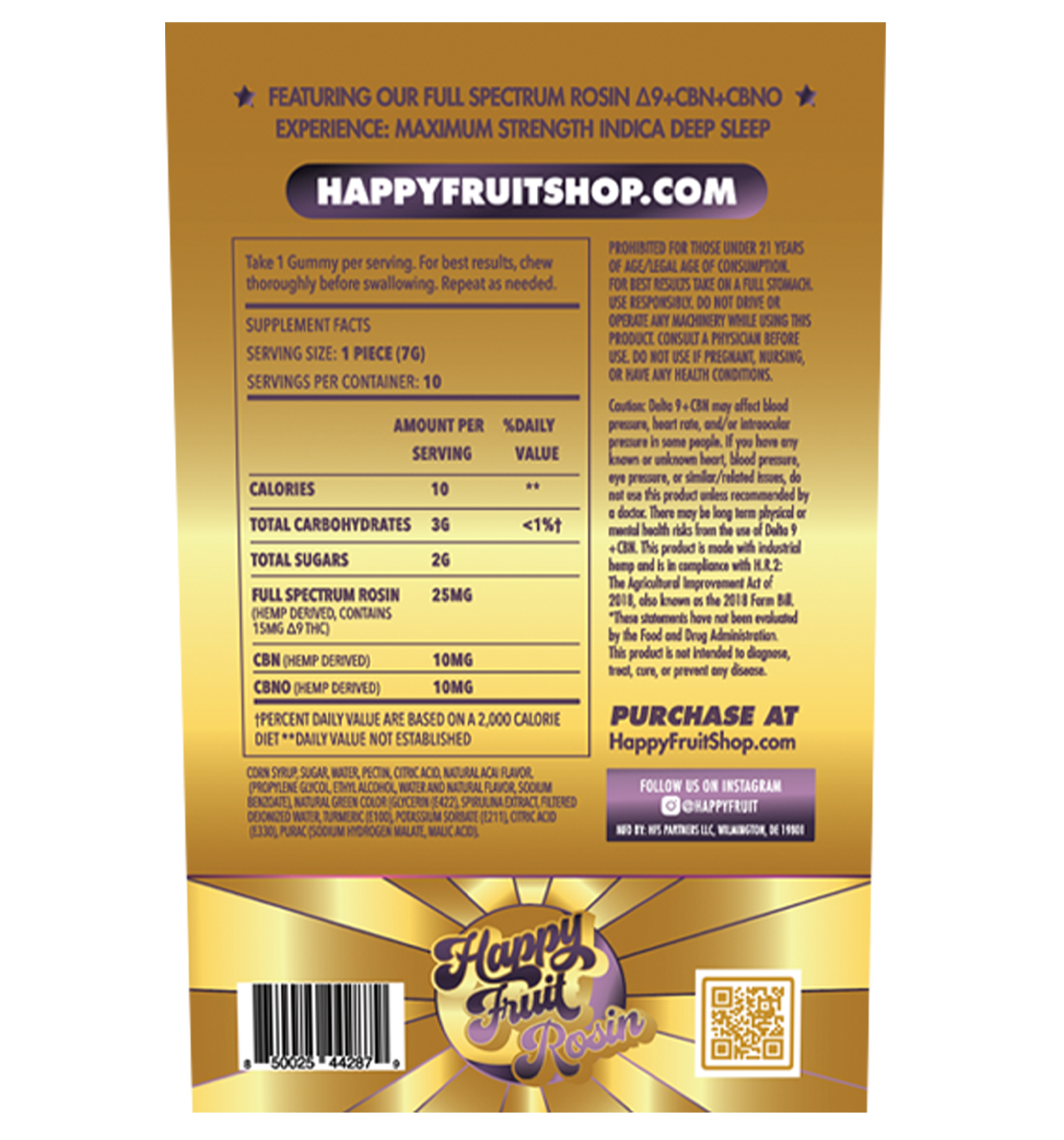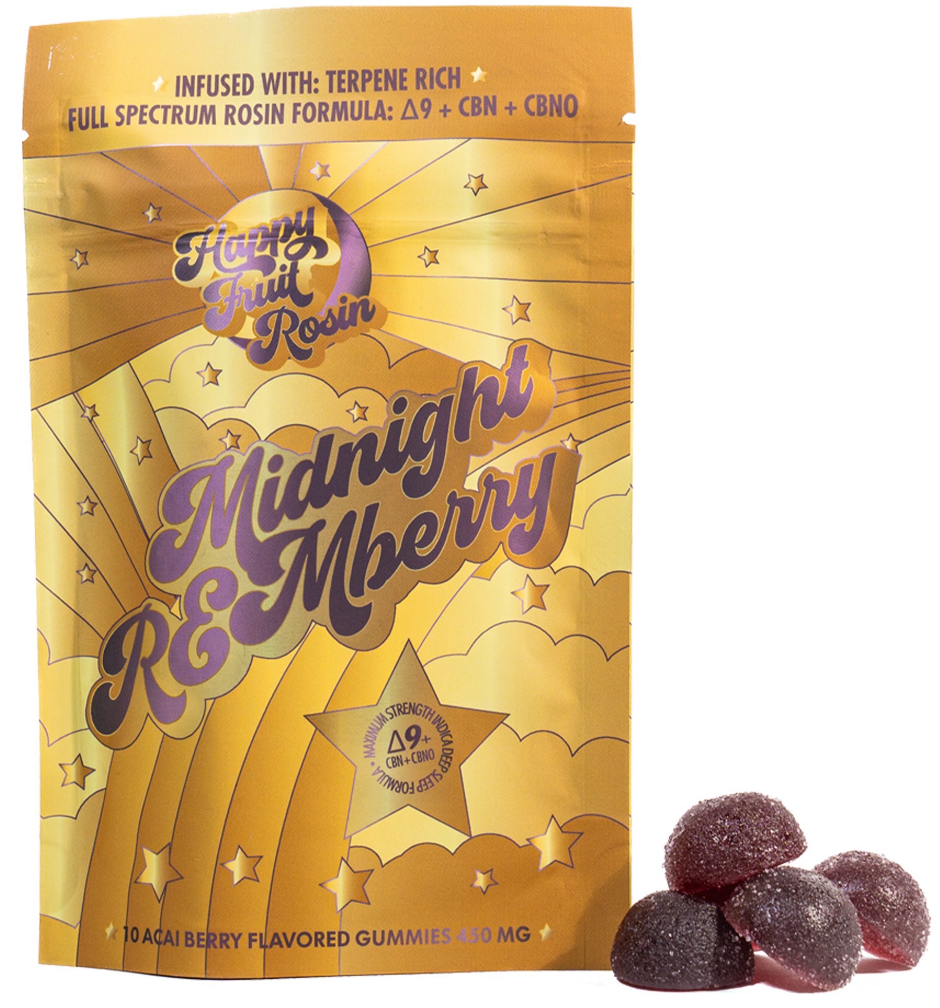 These delicious acai berry gummies are the most powerful Happy Fruit sleep gummies to date. Each gummy contains 15mg of Delta 9 THC derived from solventless Live Rosin hemp flower with 10mg CBN and 10mg CBNO. Our premium solventless Live Rosin is made by taking fresh frozen hemp flower and using pressure to extract the full spectrum hemp oil.
