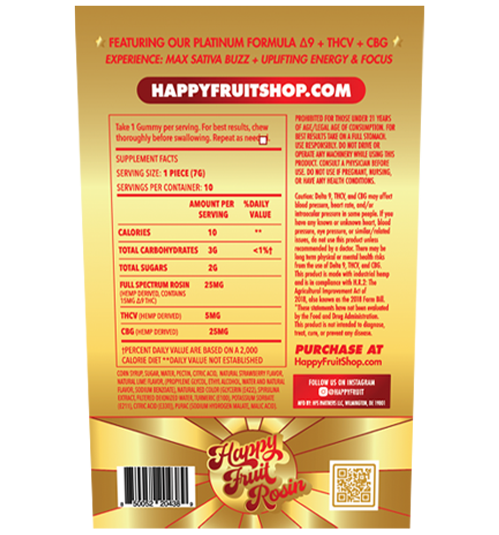 This is our strongest formula for energy and focus. Each gummy contains 25mg Full Spectrum Rosin with 15mg D9 THC, 5mg THCV, and 25mg CBG.
